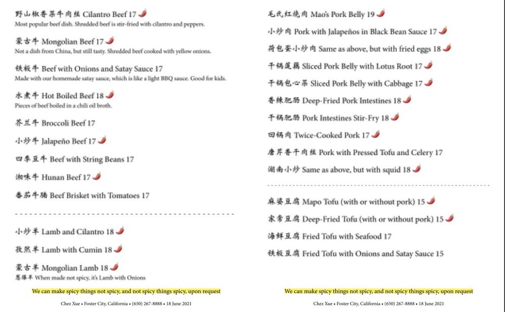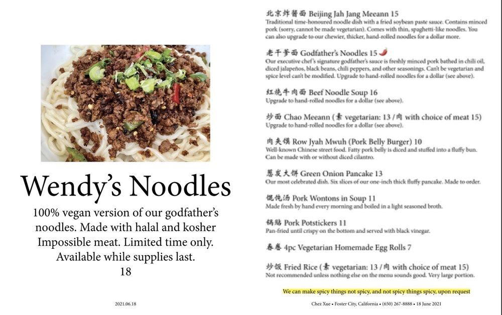Chez Xue, a Chinese restaurant located in Foster City, CA, offers a variety of dishes with options for vegans and vegetarians. The menu features popular items like Chicken Fried Rice, Cilantro Beef, and Green Onion Pancakes. Customers have praised the Godfather Noodles and green bean noodles for their unique flavors and textures. The service is efficient, with a mandatory 18% gratuity applied to the bill. Prices are on the higher side, but lunch plates are available for solo diners. Overall, Chez Xue impresses with its fast service, fresh ingredients, and must-try signature dishes.